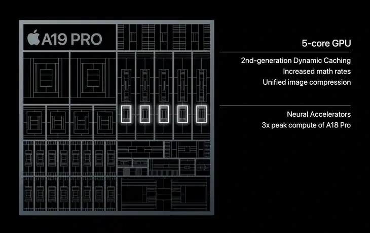 아이폰 17 라인은 Apple A19, 프로 라인은 A19 Pro가 탑재되었습니다. 기본형은 CPU 6코어·GPU 5코어·NPU 16코어, 프로 라인은 CPU 6코어·GPU 6코어·NPU 16코어 구성으로 정리되며, 프로 라인에 아이폰 최초 베이퍼 챔버가 도입되고 프레임 재질을 알루미늄으로 바꿔 열 확산을 크게 개선했다는 설명입니다.