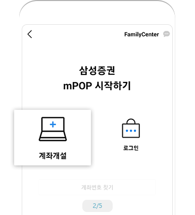 1) 휴대전화 문자(SMS)로 시작 - “바로가기” 요청 → 전송된 SMS URL로 mPOP 비대면 계좌개설 서비스 이용 - 삼성증권 모바일 앱(mPOP) 설치 필요 - 계좌개설 명의와 앱 설치 휴대전화 명의가 달라도 가능 (예: 남편 폰으로 부인 명의 계좌 개설의 신분증 인증 진행 가능)