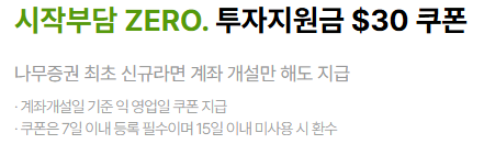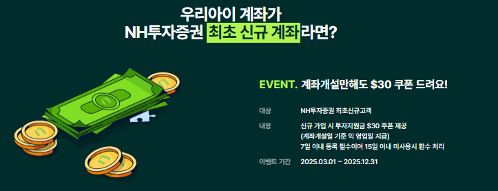 신청 후 하루 내 계좌가 개설되며, NH투자증권 최초 계좌 개설 고객이라면 30달러 상당 투자지원금 쿠폰이 지급됩니다. (2025.03~12.31 한정)